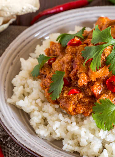 Pieces of chicken and potatoes cooked in hot vindaloo sauce garnished with coriander. A Delicacy from Goa.